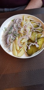 I started with a tasty humus, topped with fried chickpeas and roast carrots, while Alf ordered cold herring for some strange reason. Both very nice, and served with fresh bread.