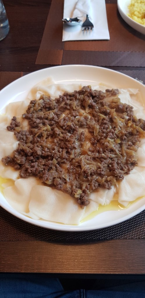 For mains, I ordered Khingali. I’d never eaten anything quite like it before, though it was rather reminiscent of the Afghan Mantu we’d eaten at Ariana II. Khingali consists of large flat noodles that are boiled then topped with minced beef and onions, and you can drizzle yoghurt sauce over it. It’s simple, moreish and very filling.