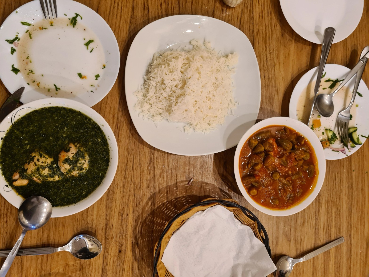 I’ll start with my Molokhia, which still makes me queasy thinking about it weeks later. The dish is made of “slow cooked corchorus leaves”. I’d imagined this to be spinach-like. Instead, the cooking turns the leaves into a gloopy gunge. The first spoonfull I drew out of the swampy bowl appeared to have a hair in it, until I realised it was actually a string of slime, stretching mozzarella-like. But unlike mozzarella, this wasn’t pleasant. Corchorus leaves have the texture of cold pondweed, with a faintly citrus tang. Altogether very unpleasant. My bowl of cold, luminescent viscosity was topped with an unseasoned, room temperature, roast chicken thigh, which was edible once I scraped the bright green goo off.