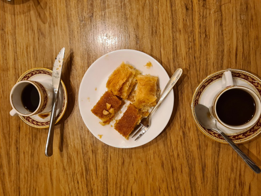 Even the worst Middle-Eastern restaurant can always be counted on to serve up a decent desert, since they always have a few baklava – and Ali Baba’s were decent enough. I ordered an Egyptian coffee too, to get that muddy Molokhia tang out of my mouth. Egyptian coffee is of the extremely strong kind, served black, with fine grounds in the bottom of the cup. In every other country they take the edge off by plying it with sugar. Not at Ali Baba’s though. My mouth went from the pungent piquancy of cochorus to bitter roughness.
