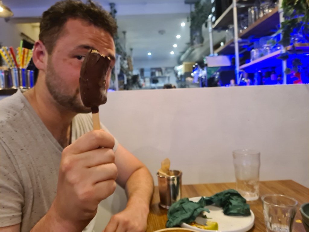 They didn’t have much in the way of desserts, and half of what they did have wasn’t available. We shared a parmesan cake, which was savoury and dry, but rather nice – could’ve done with some ice cream though. Alf got a chocobanana which did exactly what it said on the tin.